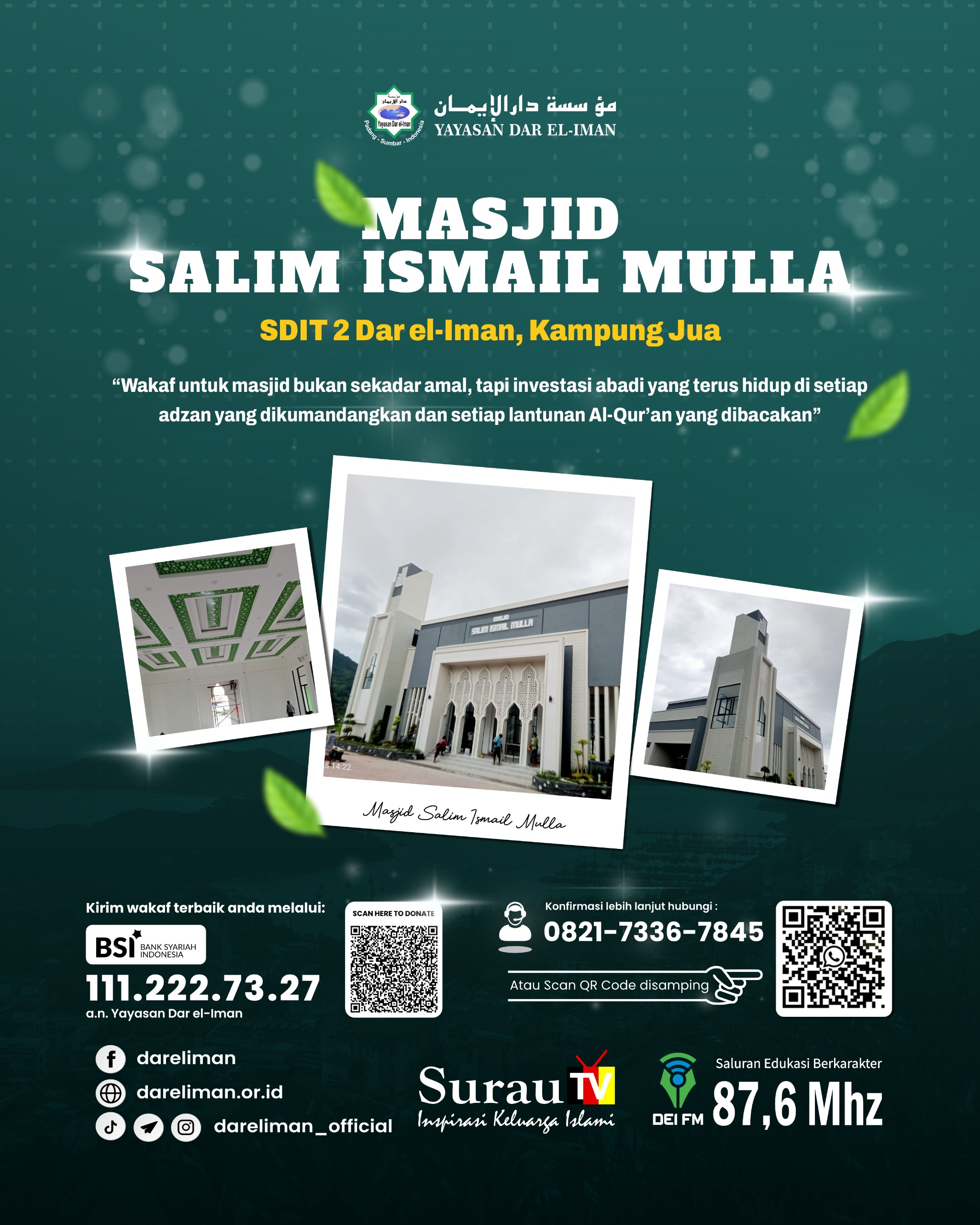 Wakaf untuk masjid bukan sekadar amal, tapi investasi abadi yang terus hidup di setiap adzan yang dikumandangkan dan setiap lantunan Al-Qurโ€™an yang dibacakan.โ€ Masjid Salim Ismail Mulla dibangun sebagai pusat ibadah, pendidikan, dan aktivitas dakwah di lingkungan SDIT 2 Dar el-Iman, Kampung Jua. Hadirnya masjid ini diharapkan menjadi ladang pahala jariyah bagi siapa pun yang turut andil dalam proses pembangunannya. Kami mengajak Anda untuk berpartisipasi dalam wakaf pembangunan masjid, sebagai bentuk investasi akhirat yang tidak akan pernah terputus. ๐Ÿ’ณ Salurkan Wakaf Terbaik Anda Rekening Wakaf: Bank Syariah Indonesia (BSI) 111.222.73.27 a.n. Yayasan Dar el-Iman ๐Ÿ“ฒ Konfirmasi & Info Lebih Lanjut: 0821-7336-7845 Atau Scan QR Code di poster untuk donasi instan! ๐Ÿ“ก Dukung Dakwah & Pendidikan Islam Ikuti berbagai program edukasi dan dakwah melalui: ๐ŸŒ Website: dareliman.or.id ๐Ÿ“บ Surau TV โ€” Inspirasi Keluarga Islami ๐Ÿ“ป DEI FM 87,6 MHz โ€” Saluran Edukasi Berkarakter ๐Ÿ”— Media Sosial: Instagram | Telegram | TikTok โ†’ @dareliman_official